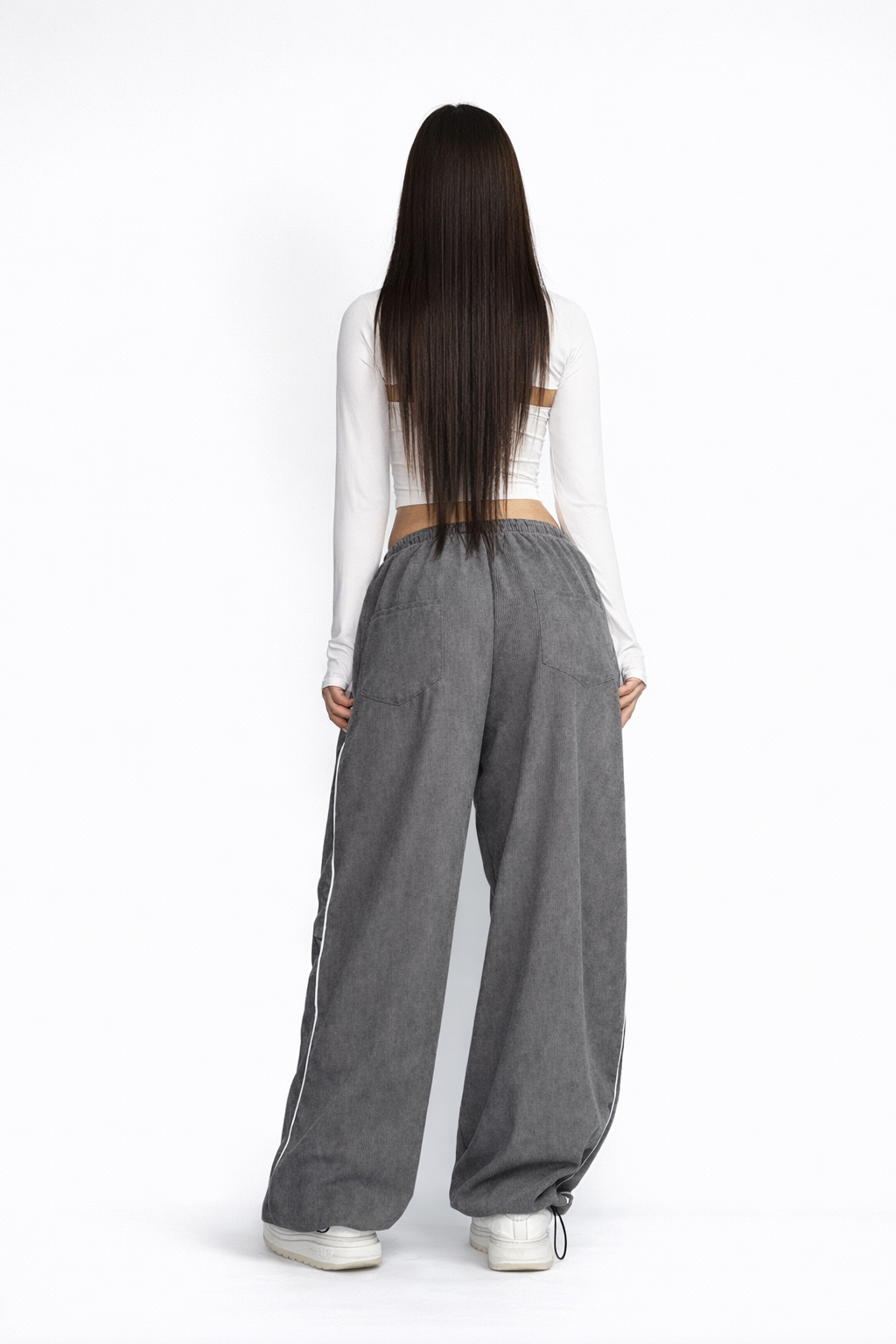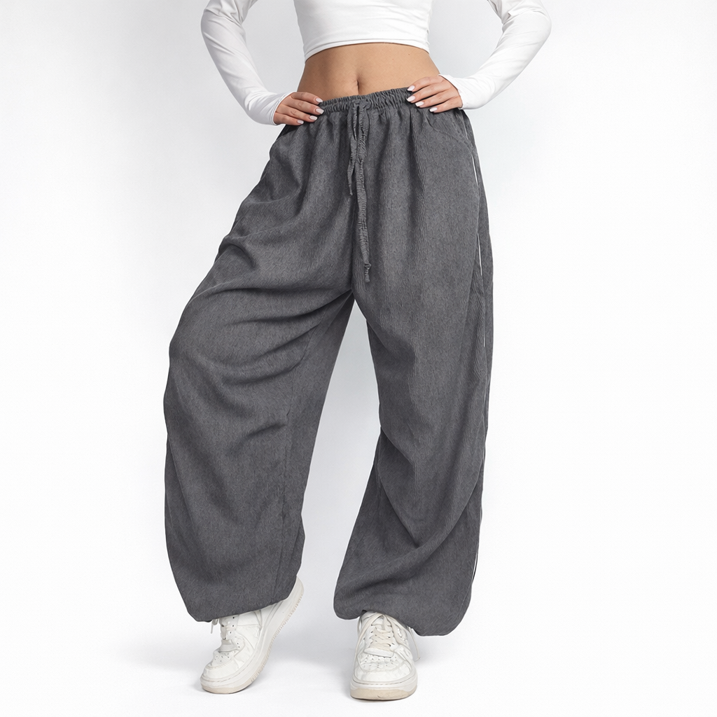 Штани мають вільну посадку, тримають форму та виглядають об’ємно. Тканина не тягнеться, тому не розрахована для активних тренувань чи танців — ідеально підходить для щоденного носіння.