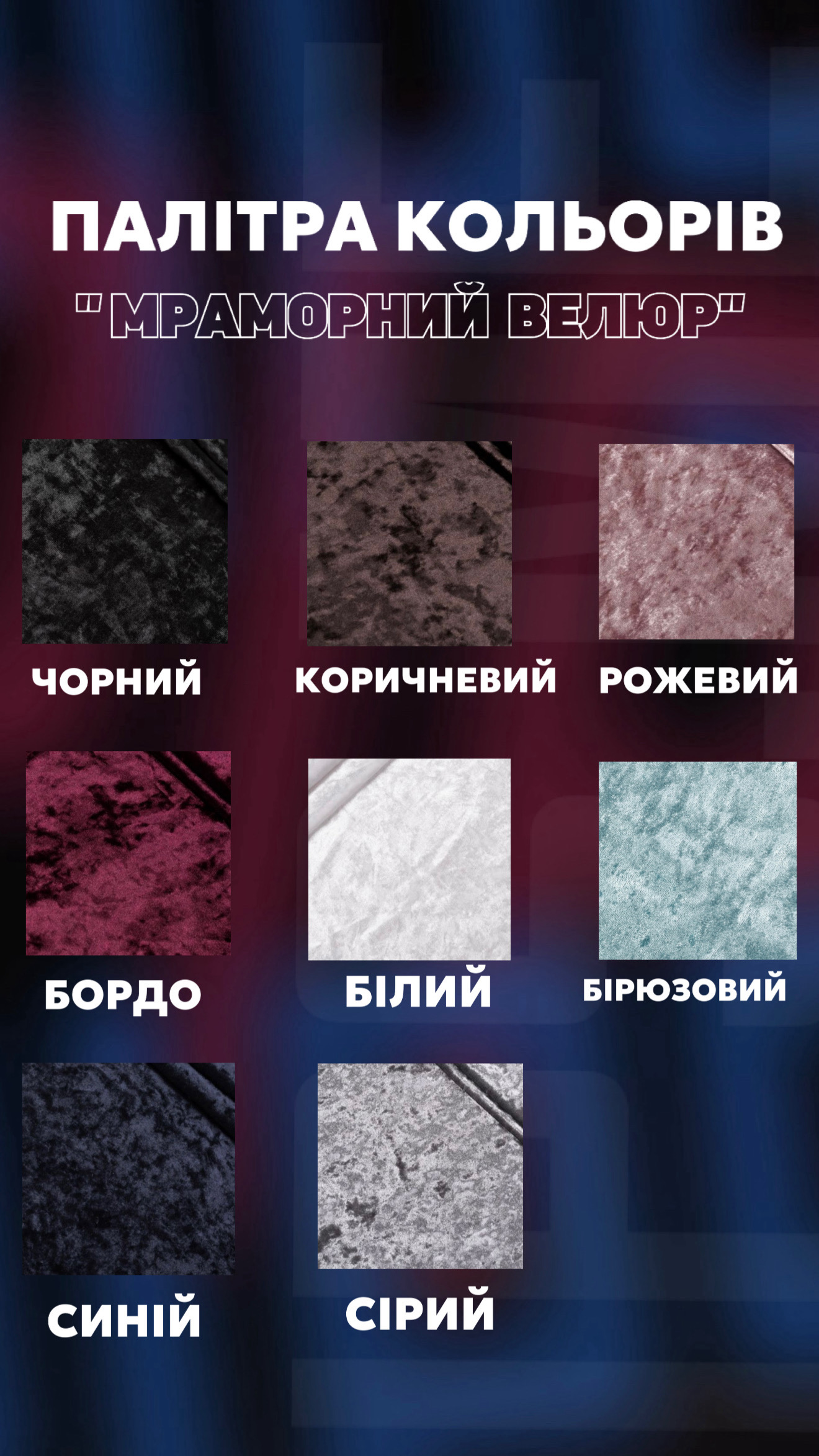 Палітра: чорний, коричневий, рожевий, бордо, білий, бірюзовий, синій, сірий
