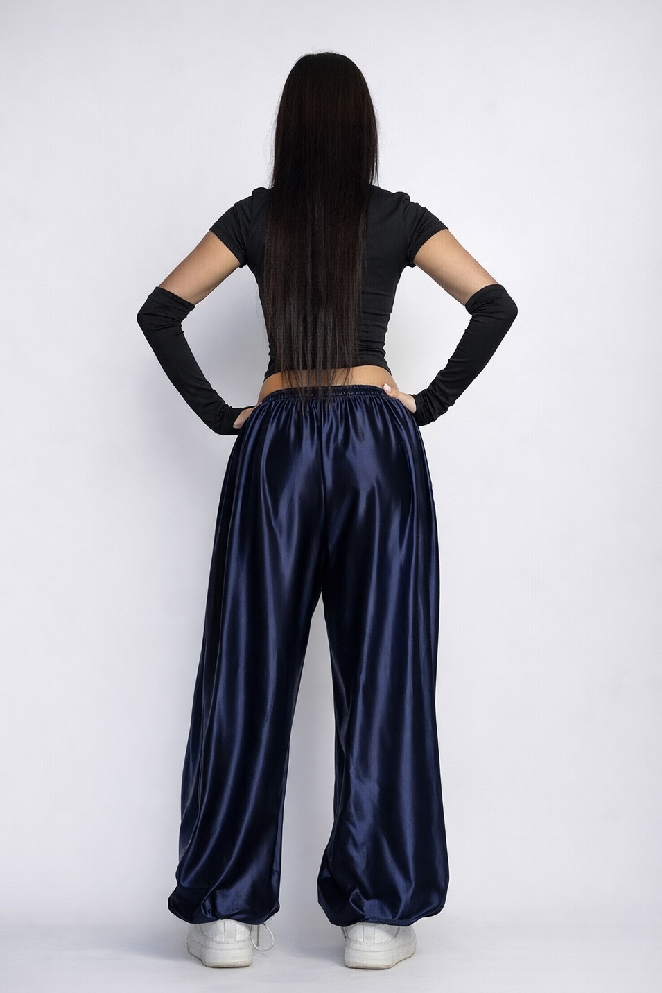 Модель із заниженою матнею, передніми кишенями та еластичною талією з регулюванням. Низ штанин доповнений шнурком із фіксатором, що дозволяє змінювати силует — носіть як джогери або як палаццо.