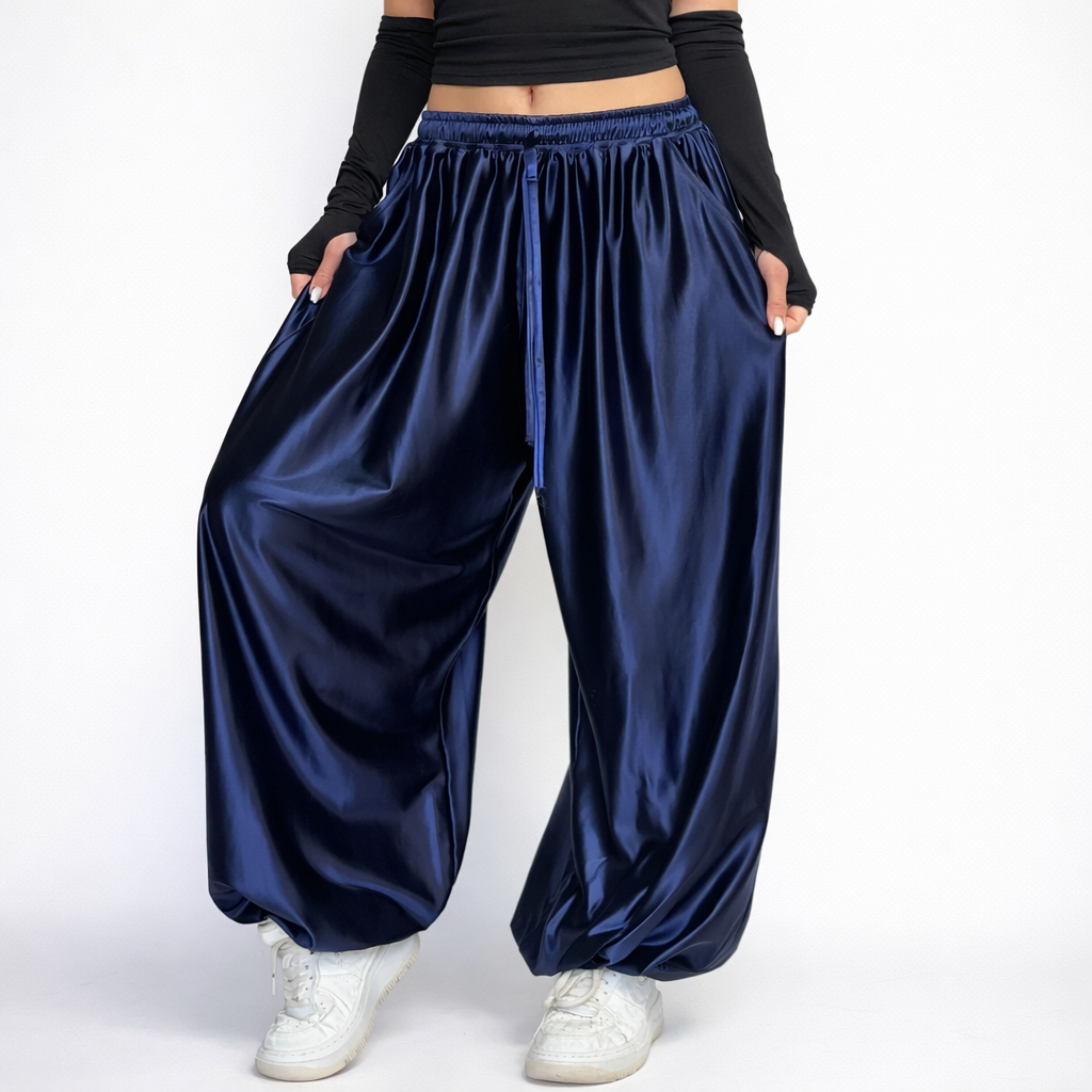 Оверсайз штани з легкого трикотажу з м’яким сатиновим сяйвом.